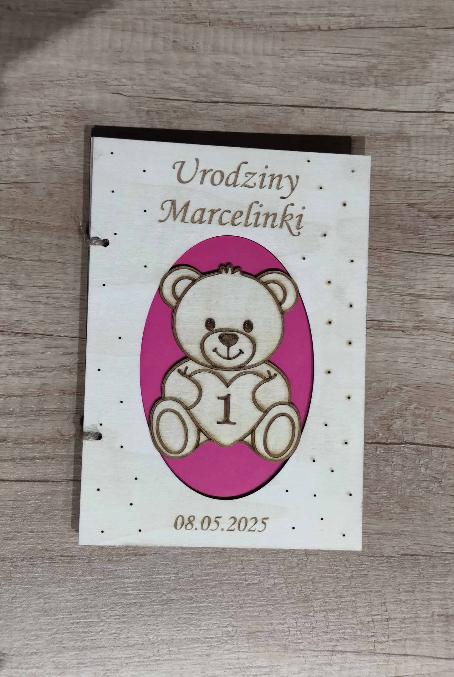🧸 Uroczy wzór misia – na okładce znajduje się wycinany motyw misia trzymającego serduszko z cyfrą „1”.