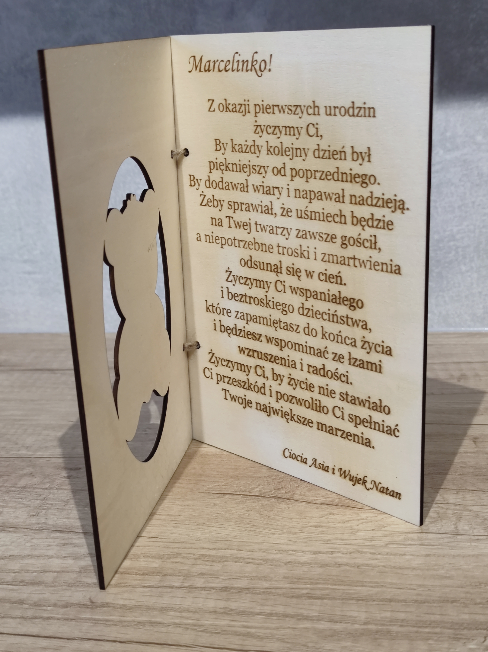 Nasza drewniana księga z grawerem to połączenie elegancji, personalizacji i wyjątkowych życzeń – idealny upominek na Roczek.