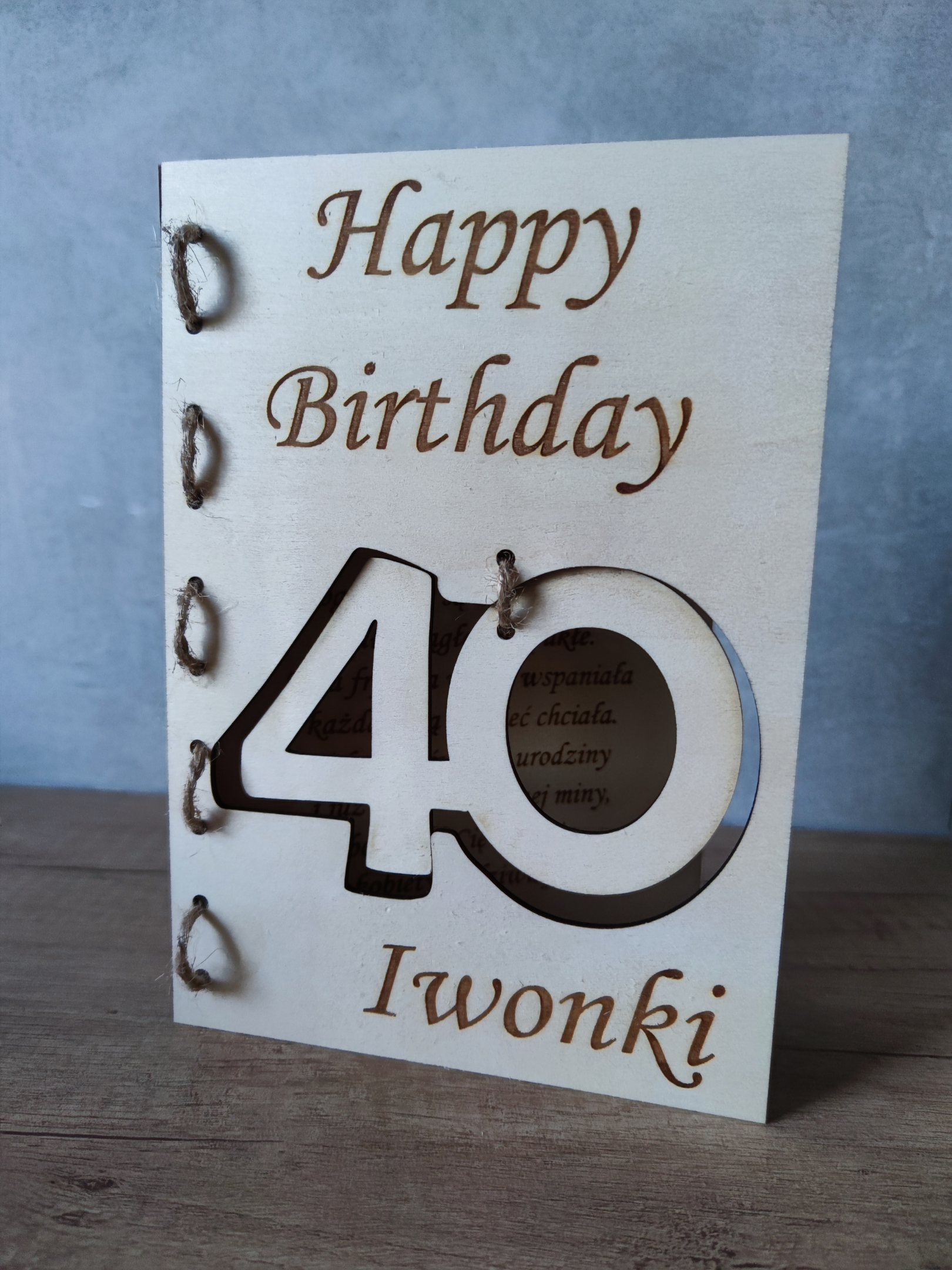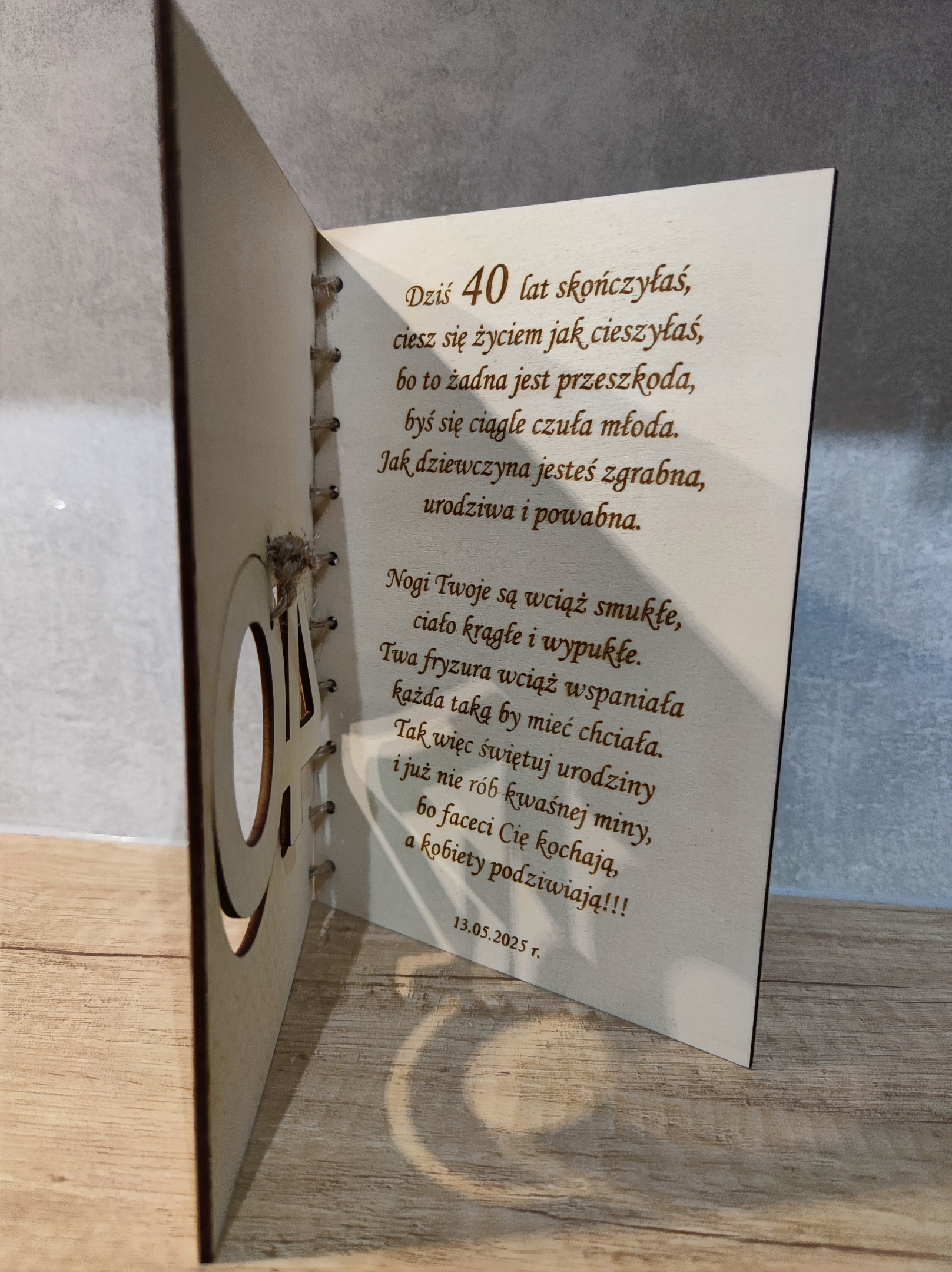 🔢 Wyjątkowy element 3D – liczba „40” została wycięta ze sklejki i umieszczona na sznureczku, co nadaje całości unikalnego charakteru.